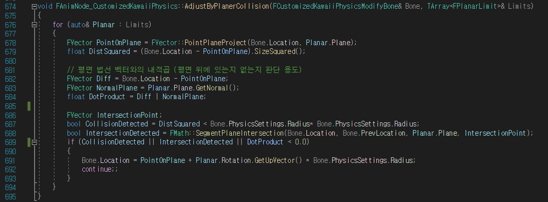 682번줄: 현재 뼈의 위치 벡터 - 현재 뼈를 평면 충돌체에 정사영한 위치 벡터 => 평면으로부터 현재 뼈의 위치 벡터